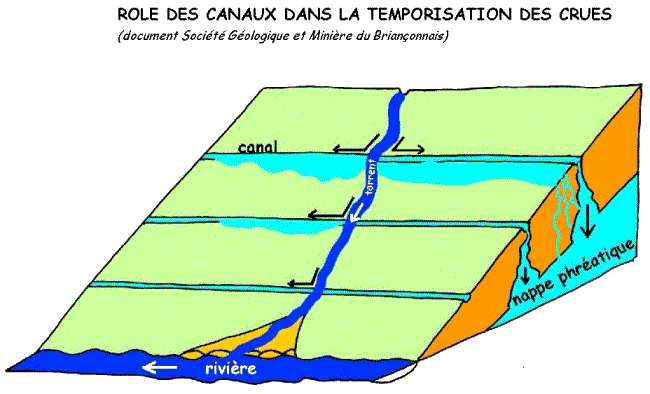 L'eau des pr�cipitations ne rejoint pas directement les rivi�res car elle est "captur�e" par les cuvettes des canaux. De ce fait, son arriv�e dans le lit des rivi�res est �tal�e dans le temps : les canaux sont des temporisateurs de crues.