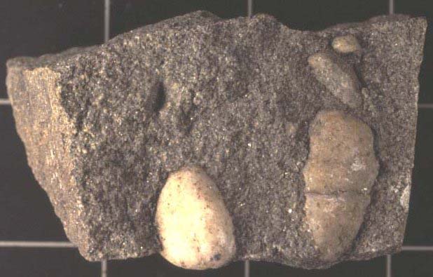 Gr�s houillerLa pr�sence de galets de forme particuli�re, d�montre que le gr�s houiller r�sulte de la consolidation d'un s�diment fluviatile. (Cliquez sur l'image pour revenir au texte)