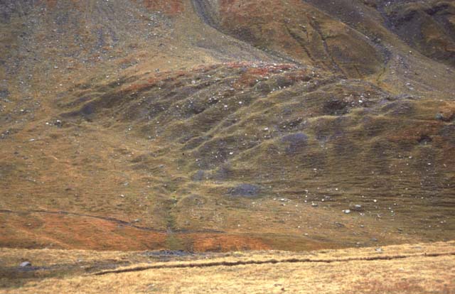 Les trous visibles sur cette photo sont des "grattages" qui ponctuent les veines. A la fonte des neiges, ces grattages se remplissaient d'eau et devaient �tre abandonn�s. Il fallait en percer de nouveaux. Il s'agit plus d'une technique de "collecte" plus que d'une technique d'exploitation.