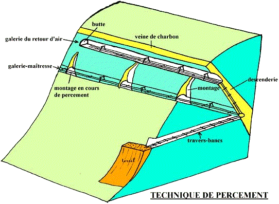 La ventilation des galeries �tait obtenue par un syst�me de convection naturelle de l'air entre 2 galeries superpos�es : la galerie d'exploitation et la galerie dite du "retour d'air". A d�part, des montages assuraient la communication entre les 2 galeries. Une fois la ventilation assur�e, l'exploitation pouvait commencer.