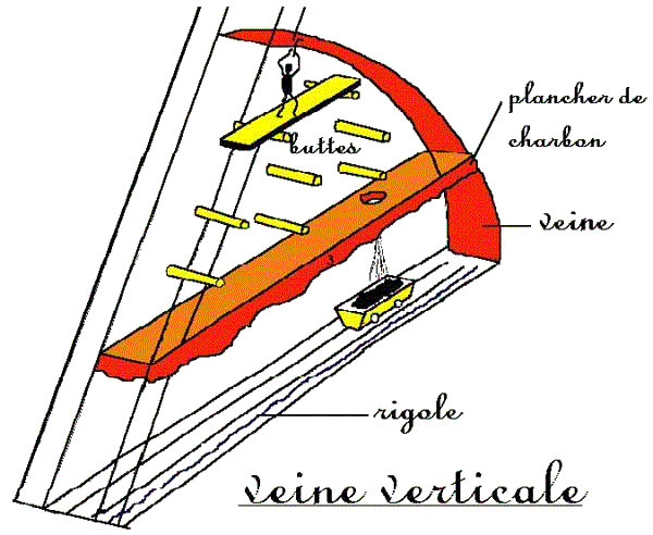 Astucieusement, les mineurs ont conserv� un plancher de charbon au-dessous de la zone d'exploitation. Le trou perc� dans ce plancher joue le r�le de "tr�mie" : il permet de collecter le charbon pour charger les wagonnets.