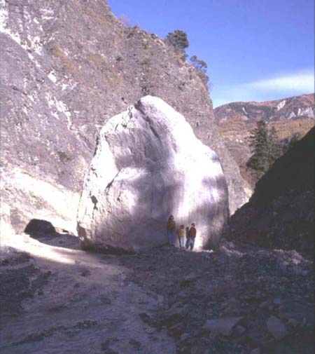 1- PUISSANCE ET ampleur ET des ph�nom�nes 1.1- ampleur des transport Document 5: extrait du film vid�o "d�linquance torrentielle" r�alis� par le CEMAGREF8, d�crivant la crue du torrent de Ravoire en Maurienne en 1981. Cet extrait est inclus dans l'une des cassettes de "ma terre" d'Haroun Tazieff. On y voit d'�normes blocs qui tendent � flotter et se d�placent par bonds dans une lave torrentielle. Objectif vis� Lors d'un charriage les blocs roulent entra�n�s par l'eau, dans une lave torrentielle ils sont port�s par la lave. Densit� de la lave : proche de 2. Densit� des blocs : dans certains cas, � peine sup�rieur � 1,8 Exploitation Comparer le d�placement des blocs dans une lave torrentielle et lors d'une crue normale. Hypoth�se permettant d'expliquer les diff�rences. Document 6: les blocs du torrent du Boscodon Le torrent du Boscodon est l'un des plus gros torrents d'Europe. Il se jette dans le lac de retenue de Serre Pon�on, pr�s d'Embrun, dans les Hautes Alpes. En juin 1998, une lave torrentielle a "port�" le bloc photographi� ci-dessous.