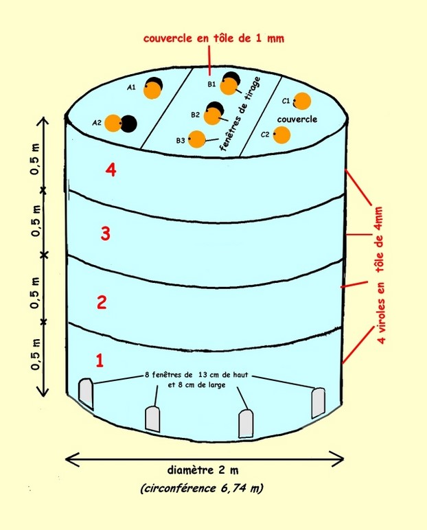 Formé de 3 viroles superposées, il était fermé par un couvercle et sa partie inférieure était doublée intérieurement. Des fenêtres de ventilation avec volets orientables étaient percées à la base et sur couvercle (schéma 2).