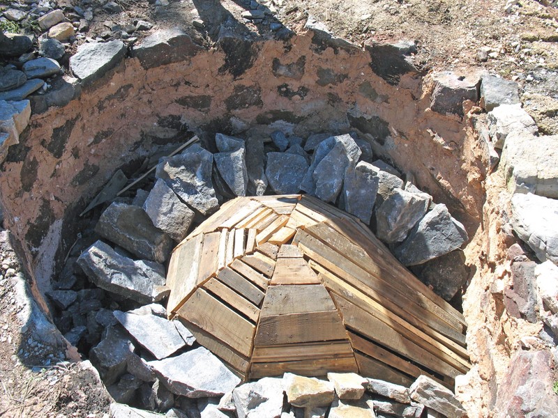 La voûte doit obligatoirement être bâtie avec des pierres à chaux. A la fin de la combustion, elle se transforme en chaux vive, puis au contact de l'humidité de l'air elle se délite et finit par s'effondrer. Par chance, nous avons retrouvé dans le secteur de le Roche de Rame, un four qui n'avait jamais été mis à feu et qui, de ce fait, possédait encore sa voûte. En 2005, nous l'avons reconstruit à l'identique sur l'espace fours de Villard St Pancrace à l'échelle ½. (photo 4).