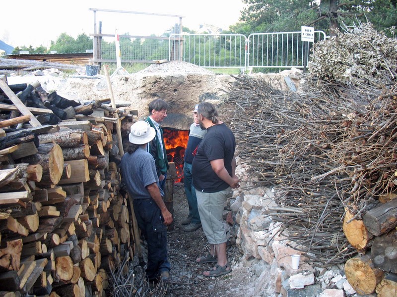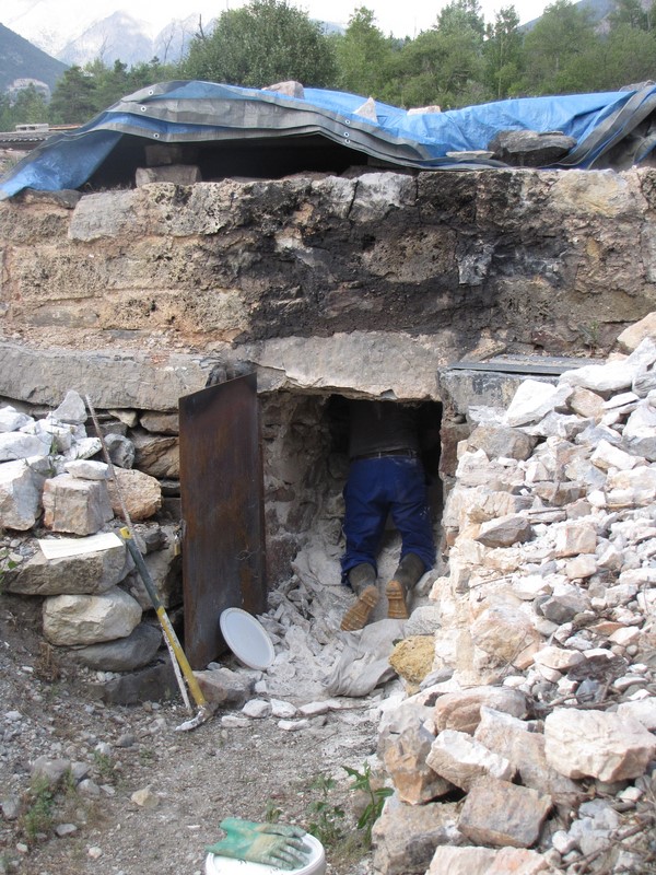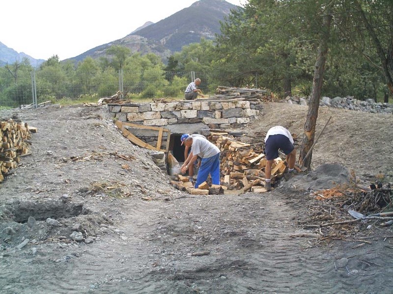 Voir la fin de l'enfournage dans un four à chaux à combustible bois