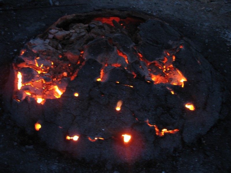 Un feu de bois est allumé sous le foyer et maintenu pendant toute une nuit. Les briquettes de charbon commencent alors à brûler (odeur de soufre),