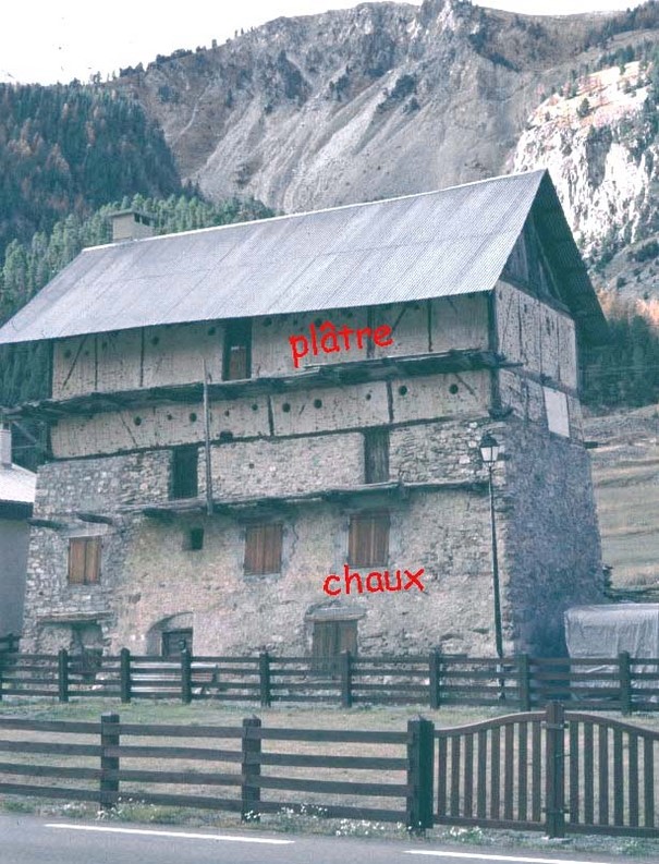 Le plâtre provient de la déshydratation d'une roche, le gypse, à une température de l'ordre de 150°. Il est utilisé essentiellement pour enduire les parties hautes des maisons (photo 1) protégées de la pluie (car il est soluble dans l'eau).
