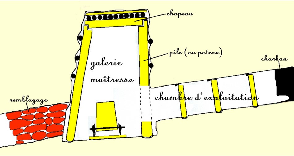 Les veines horizontales étaient rares. Dans ce cas, une galerie "maîtresse" (schéma 1) débouchait sur des chambres d'exploitation (document 2). Des morceaux de troncs (les "buttes") y empêchaient l'effondrement du "toit" de la veine.